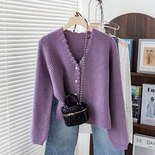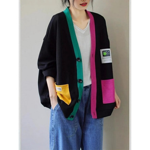 2024 autumn and winter new V-neck wool cardigan jacket for women loose large size contrasting sweater short style