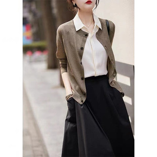 Early autumn thin wool knitted cardigan for women loose short bright silk round neck worsted cashmere sweater sweater jacket top