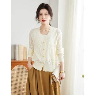 Early spring small hollow short knitted cardigan for women cute style loose slimming versatile thin long-sleeved top summer