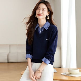 Spring and Autumn Clothing 2024 Fashionable Western Style Loose Splicing Bottoming Fake Two-piece Pullover Sweatshirt Women's Shirt Collar Top Trend